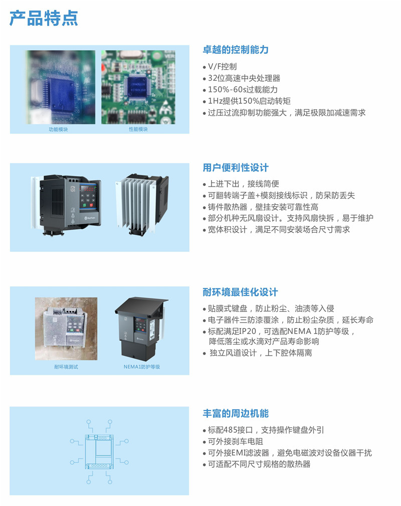 产品简介:针对低压通用型变频器市场,中小型自动化配套和改造,郎丰隆重推出M1系列防护经济型变频器。M1系列可应用于食品包装、木工雕刻、自动化流水线、陶瓷、纺织、工业洗衣机、金属加工、风机水泵等行业,防护等级高、保护功能齐全、性能卓越、调试简单。